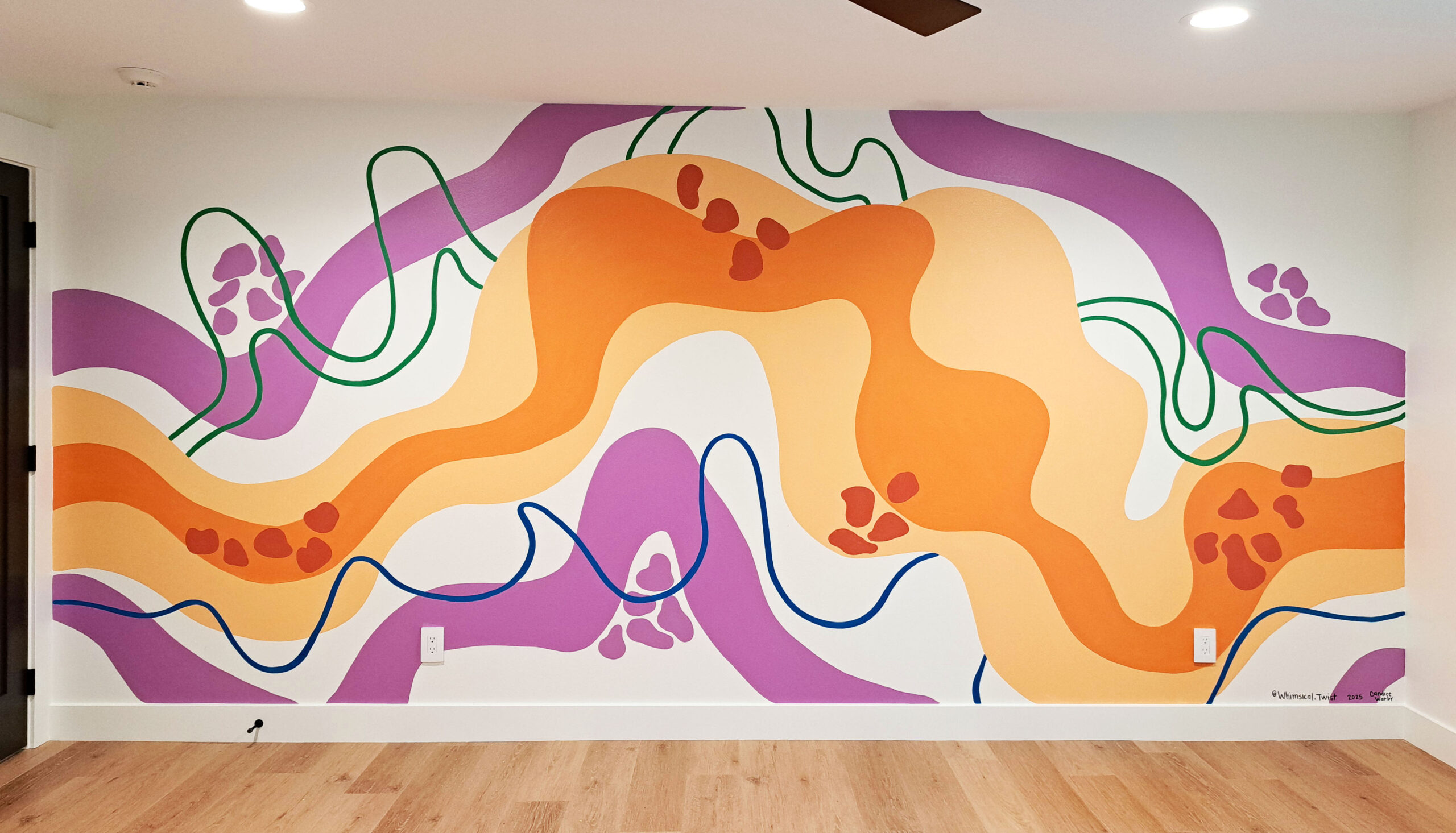Each mural is painted by hand. The paint used is determined by the surface being painted. I mostly use acrylic paint and brushes (interior or exterior, as needed), and will also use spray paint where appropriate.